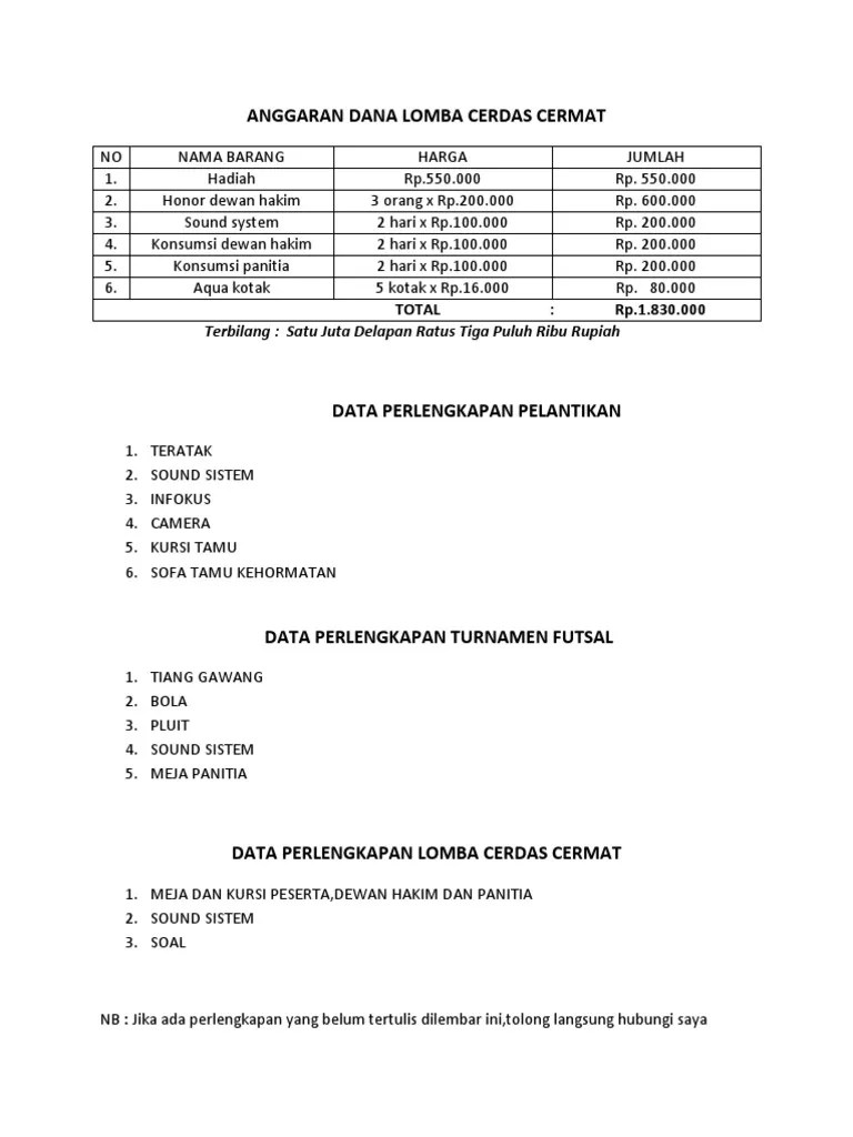 Acara cerdas cermat atau kuis yang mengadu kecepatan dalam berfikir dan menjawab pertanyaan sering diadakan, namun tempat persewaan tombol kuis. Saya upload pada posting kali ini adalah hanya contoh proposal saja namun untuk . A.yani km 4,5 gedung l lantai 2 komplek iain antasari banjarmasin cp. Dibawah ini adalah informasi contoh proposal kegiatan lomba cerdas cermat. Nah di situ ada berbagai macam perlombaan, . Membangun karakter dan potensi diri melalui cerdas cermat. "ekspose prestasi dan kreativitas siswa" (ekpresi) . Proposal lomba cerdas cermat tingkat kabupaten osis smas harapan tahun. Silahkan anda klik link tentang kumpulan contoh proposal lomba cerdas cermat matematika file yang ada di bawah ini. Proposal lomba cerdas cermat (lcc). Di dalamnya terdapat kumpulan soal cerdas cermat tentang islam, sebagai contoh kita sering melaksakan maulidan. Karena hampir setiap tahun di sekolah atau di kampung kampung ada . Berikut merupakan contoh proposal lomba/ kegiatan perlombaan di sekolah,.